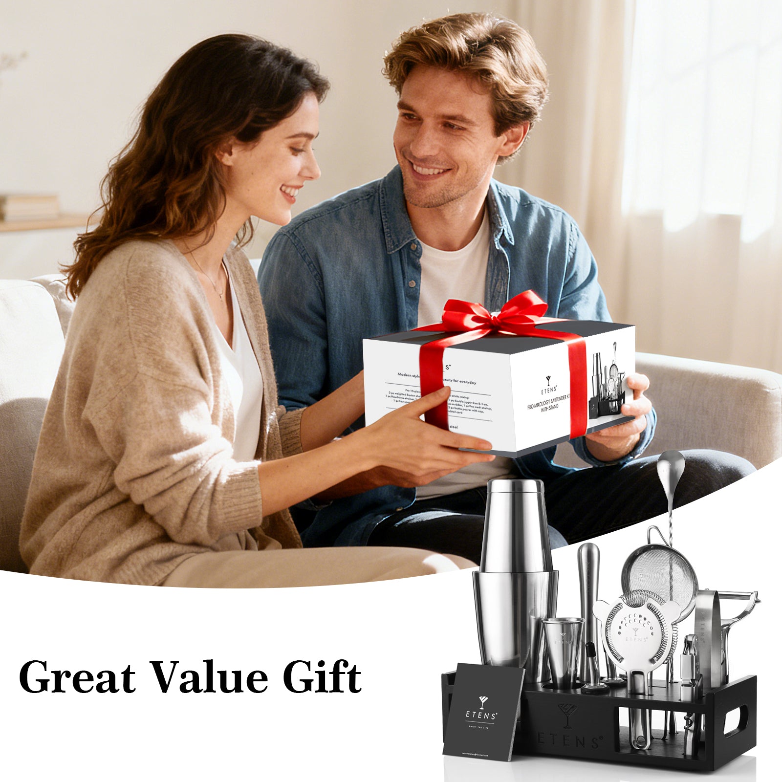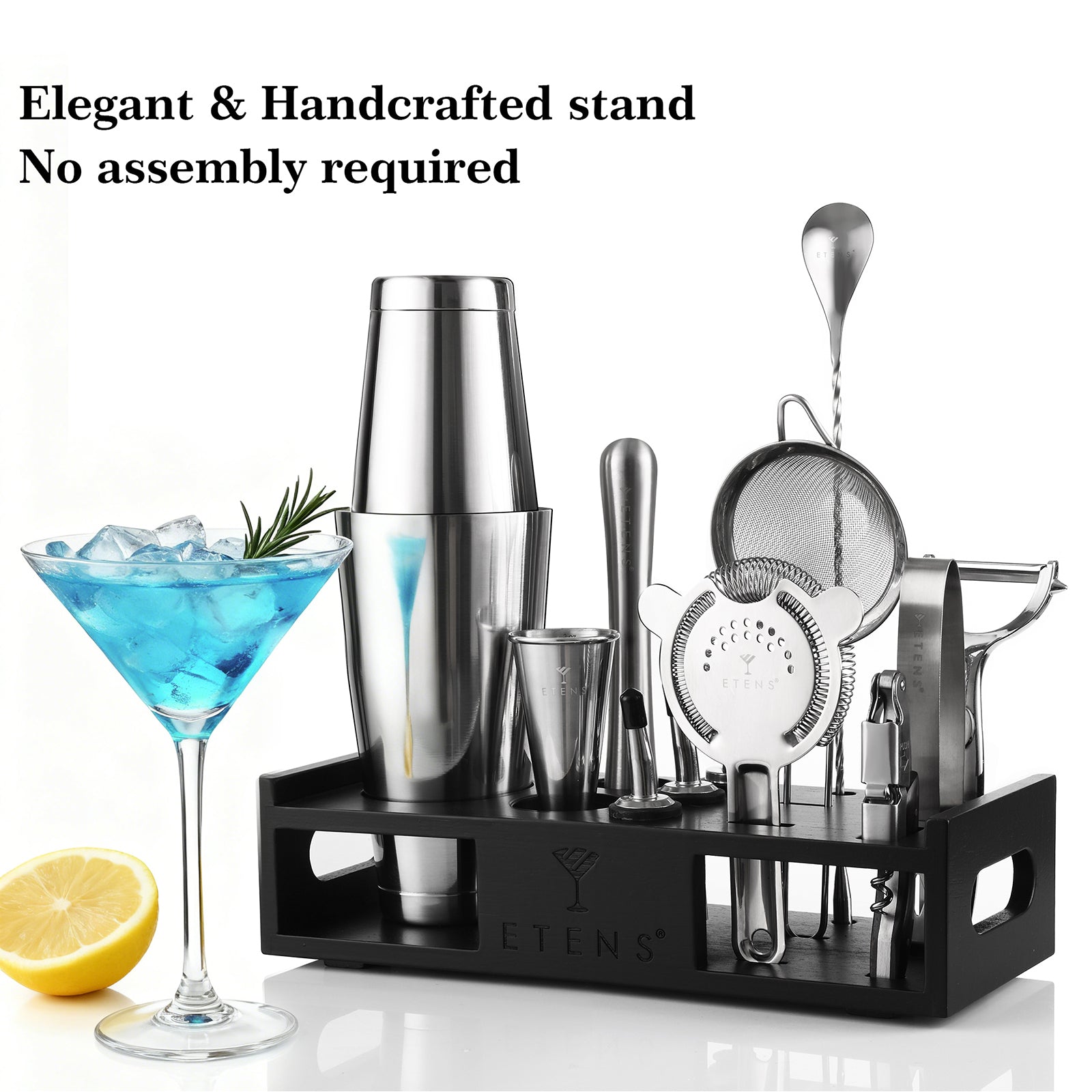 - Complete 15-Piece Bartender Kit: The ETENS cocktail kit comes with all essential bar tools: 18oz & 28oz Boston Shaker, precision Japanese Jigger (1oz/2oz), Hawthorne Strainer, Fine Mesh Strainer, Muddler, 12-Inch Mixing Spoon, Corkscrew Bottle Opener, Ice Tongs, Lemon Peeler, 3 Liquor Pourers, Recipe Cards, and a handcrafted wooden stand.